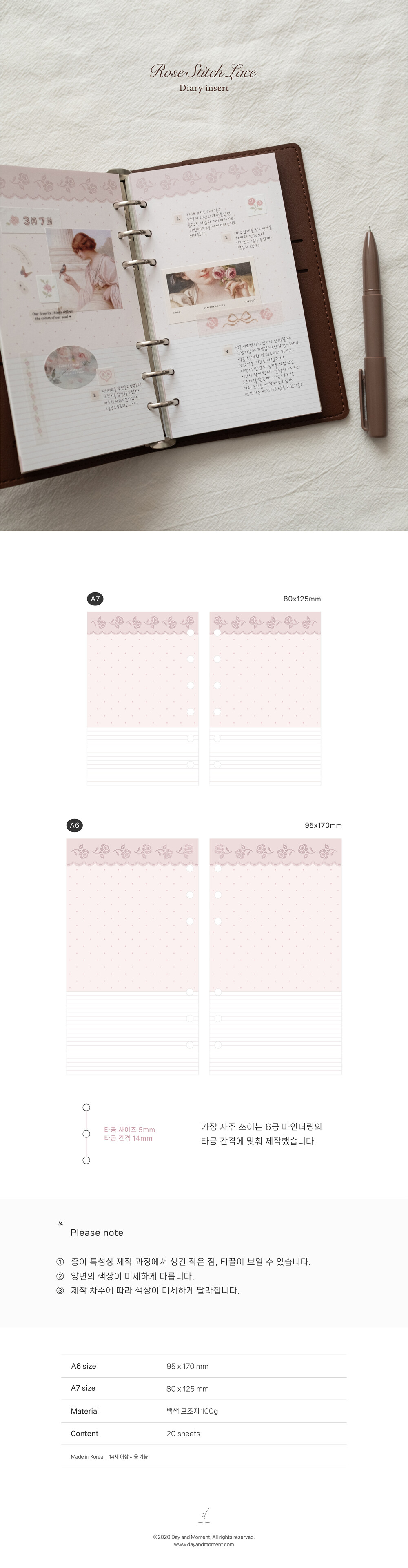 [데이앤모먼트] Rose stitch lace 6공 속지 A6 A7
