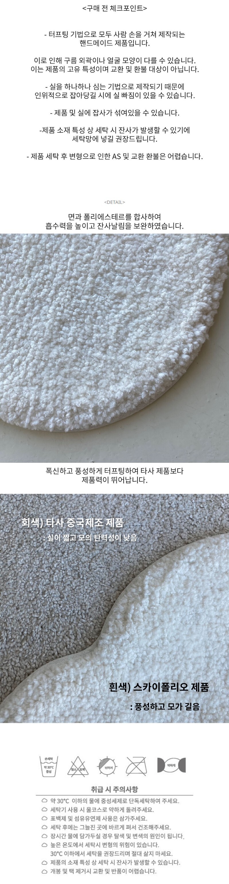 터프팅 기법으로 모두 사람 손을 거쳐 제작되는 핸드메이드 제품입니다.